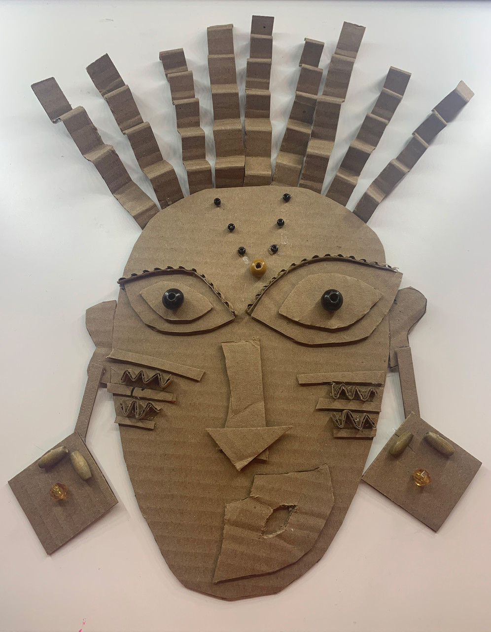 Artist Statement: My artwork is more towards the feminine side. It looks like a woman because of the shape and the size of the lips. The hair does also make it look more like a woman because the hair is long. The materials I used to create my artwork were: cardboard, a hot glue gun, beads, and scissors. What inspired me to create this was our class lesson about some of Picasso’s work and his phases. The emotion my art is expressing is indifferent; she’s just there neither happy nor sad. I did not have a specific goal while creating this I just did it intuitively. After creating this it did turn out mostly how I imagined it, I learned that I enjoyed working with stuff at home that we all see as “useless.” Another thing I learned from this project was to put some of my emotions into it so I can create something that I can relate to and not try so hard to think about what it is I want to create.
