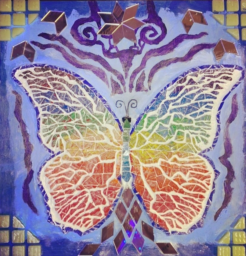 Materials: Mosaic tiles, Mirror tiles, Acrylic paint, grout