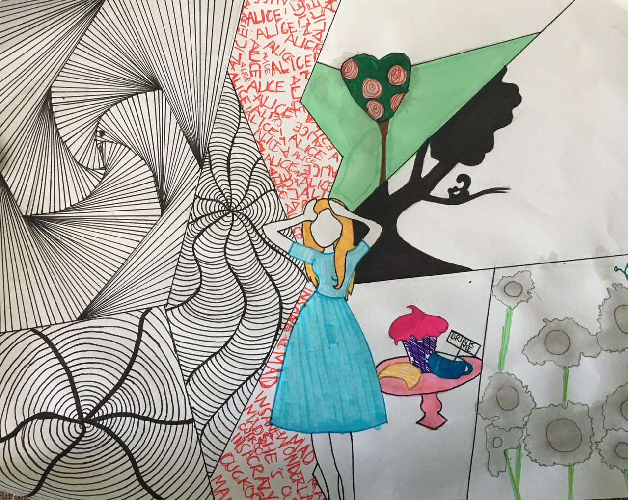 Artist Statement: “Alice in Wonderland” has always been one of my favorite childhood movies. At the time I never understood why she got dreams or visions until I researched it when I was older. Alice has many symptoms of paranoid schizophrenia, so I divided my artwork into two sides of Alice. The side she viewed of herself showed many scenes I remembered seeing as a child: Chesire- the cat, the Rose tree, the “Eat Me”/ “Drink Me” pastries, and tea-stained flowers which I painted without color to symbolize the plain white roses. On the other hand, the other side contained many illusions, like what people thought she saw. I also included her name in red and what names I imagined her being called for seeing things.