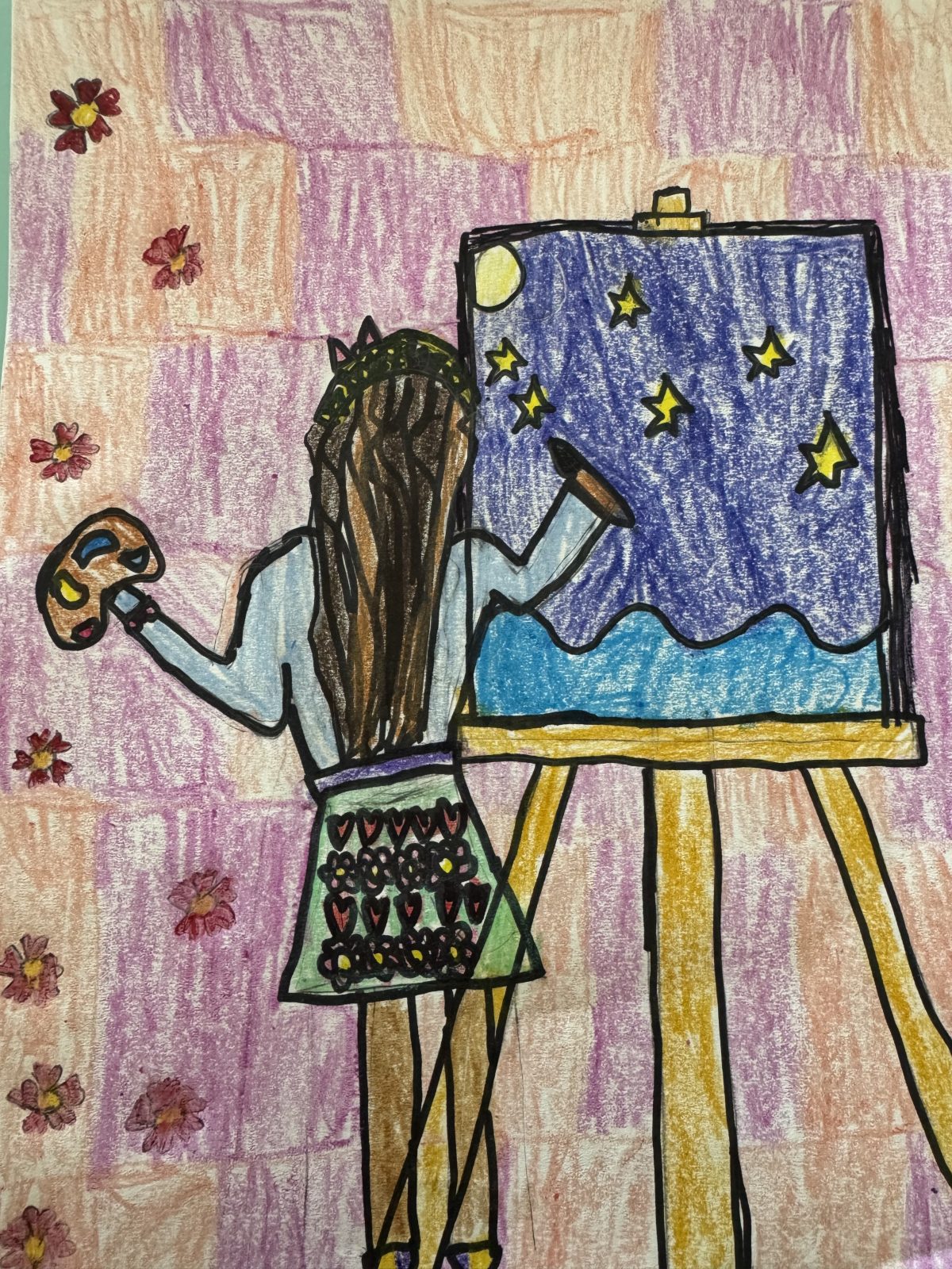 Artist Statement: For this artwork, I used regular household materials. The portrait is simple, imperfect yet captures the expression of hope. The big idea of my artwork was to show the two sides of Alice, coping with schizophrenia; how she viewed herself and how others saw her. I also wanted to include her torments, or how she might’ve looked not being able to be comprehended by others.