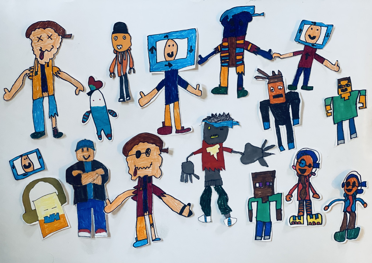 Artist Statement: This is a collage of original characters drawn with marker, cut out, and placed on a poster as a collection. Vincent creates these characters based on the unique and creative ideas he has throughout the day.