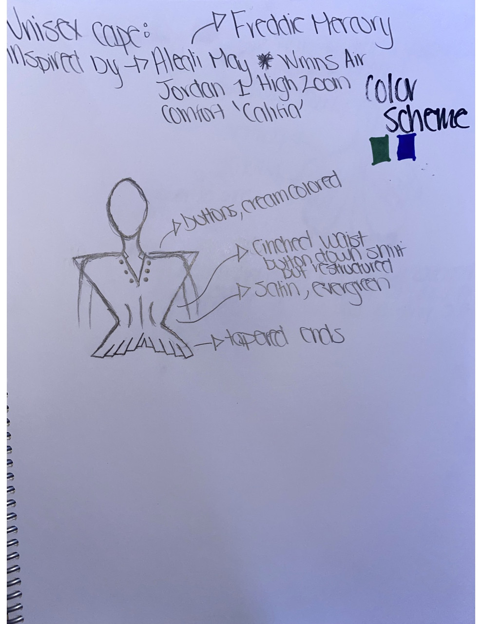 Artist Statement: I made the work submitted because I wanted to create an experience for all people, all genders, self expressions, and body types. I wanted my work to have that impact and serve as that message because fashion and clothing is another way of self expression and another way to present who you are. If you’re more comfortable in the way you present yourself and what you wear, it’ll transfer into other areas of your life. Along with that, I wanted to submit something that captivated my personal style and what fashion meant to me as I grow into someone who is more mature and ready for many different types of fashion avenues. I used many different inspirations to make my boards and designs, I was inspired by fashion icons such as Freddie Mercury, Rihanna, Virgil Aboh, ect. And brands that are very dramatic and trendy in their designs such as Balenciaga and Gucci. My artistic process is unorthodox in the sense that I don’t have a set time to sit and create, I create based upon the inspiration that I get at random times and things that I see. For instance, when I’m just scrolling on instagram, I’ll see something and think, “I would’ve done that differently, maybe with a tighter silhouette, or platform shoes to make the shoes more prominent.” or even, “I could do those sleeves with a built in corset, and adding navy to the color scheme.” Additionally, I try to use certain materials within designing in order to add more texture and character to my designs, like rope for shoe strings, more satin for tops, more metal details on purses, jeans, and jackets.