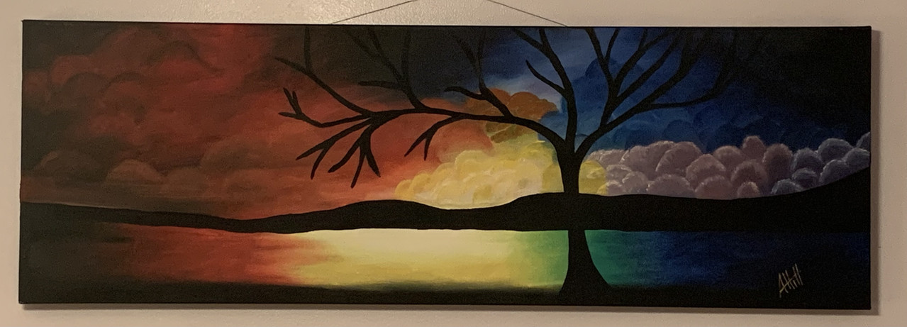 Materials: Acrylic Dimensions: 12” × 36” Description: Sunset filled with emotions shown with colors.