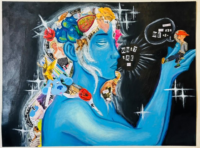 Description: This art piece represents escaping to your mind to get away from the harsh reality we live in. Society is begin depicted as hurtful words in our painting, meanwhile you see a girl’s thoughts flowing chaotically. Our mind is our safe space, the place we escape to with our thoughts.