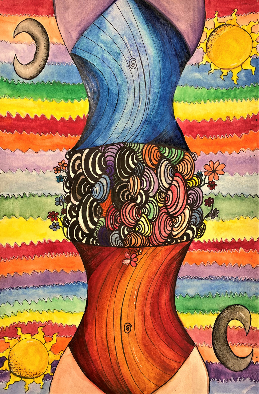 Artist Statement: My artwork ‘Helianthus’ was inspired by a song. I used chalk pastel and paper. I used the colors of a sunset for the background; most can be seen as complementary. Since the flowers are in a wide field it helps express the wildness of creativity. I use a complementary palette of yellow, green, red, blue, pink, purple, violet, brown, white, and orange. I used different shades and movements. My piece gives the texture of a chalk material