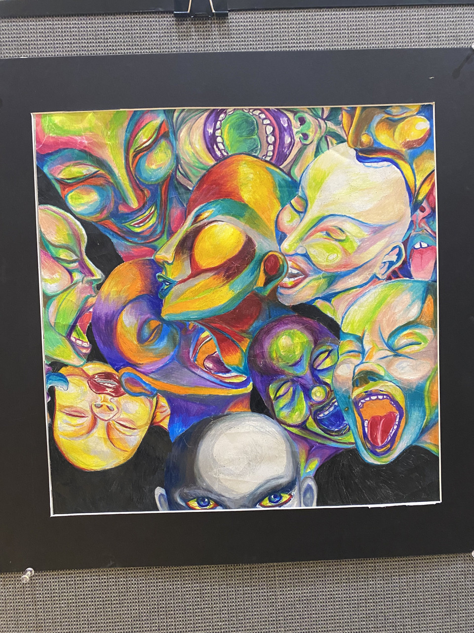 Description: The fused faces imply cannibalism as each interacts with another with an open mouth and closed eyes. Their facial expressions show a submissive and mindless state as they feast on the other. The grotesque idea transforms into an odd afterlife ecstasy, established through flashy and trippy-like color combinations. The bottom face is dull compared to the rest. It stares straight at the audience to judge the events above in a God-like presence, where no deity exists to moralize these miscreants.