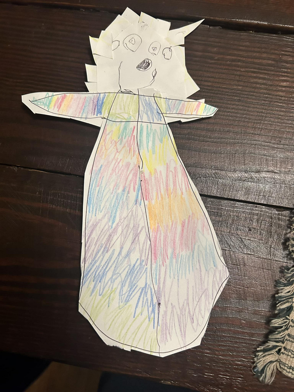 Description: Ana made a paper doll of child Dolly Parton from the Dollywood stage show about Dolly’s life. It represents Dolly as a child wearing the coat of many colors–a coat of rags–that Dolly’s mother made her. Ana first made the dolls body and head. Then she made the coat of many colors and pasted it onto the doll. She also individually colored each piece of curly hair and pasted each one onto the doll’s head. The doll is starting to get a bit worn, and Ana has since colored in the eyes, but we still have the doll, which is special to the whole family as well as a testament to Ana’s creativity.