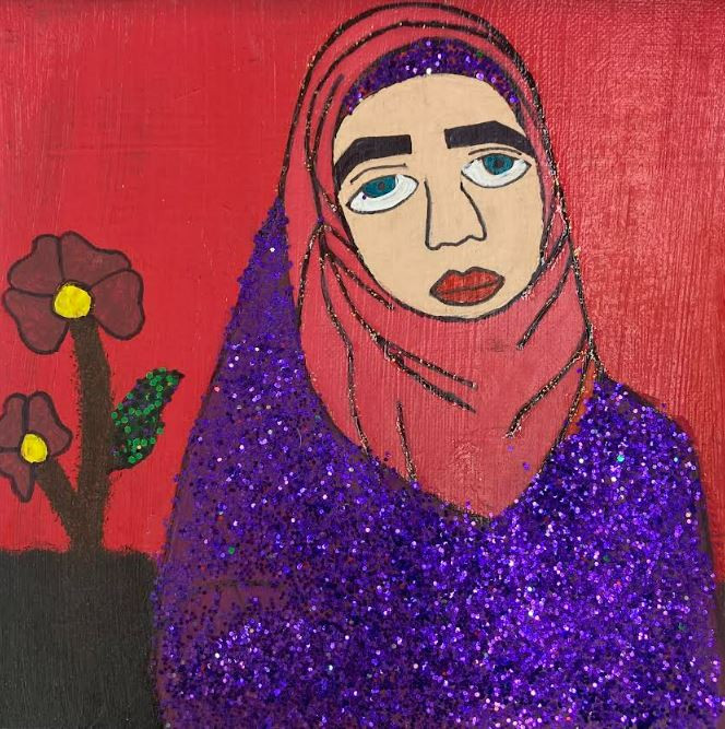 Description: Always looking over from above, the golden Buddha deity symbolizes the sun and good fortune for that is the meaning of my name: goddess of the sun. Its hands holding my face connects us together, depicting how my dad’s culture will always be with me as if there’s truly a guardian looking over me. The vibrant hue of yellow and the bright reddish-orange emphasize the warmth that ignites me even when all seems lost.