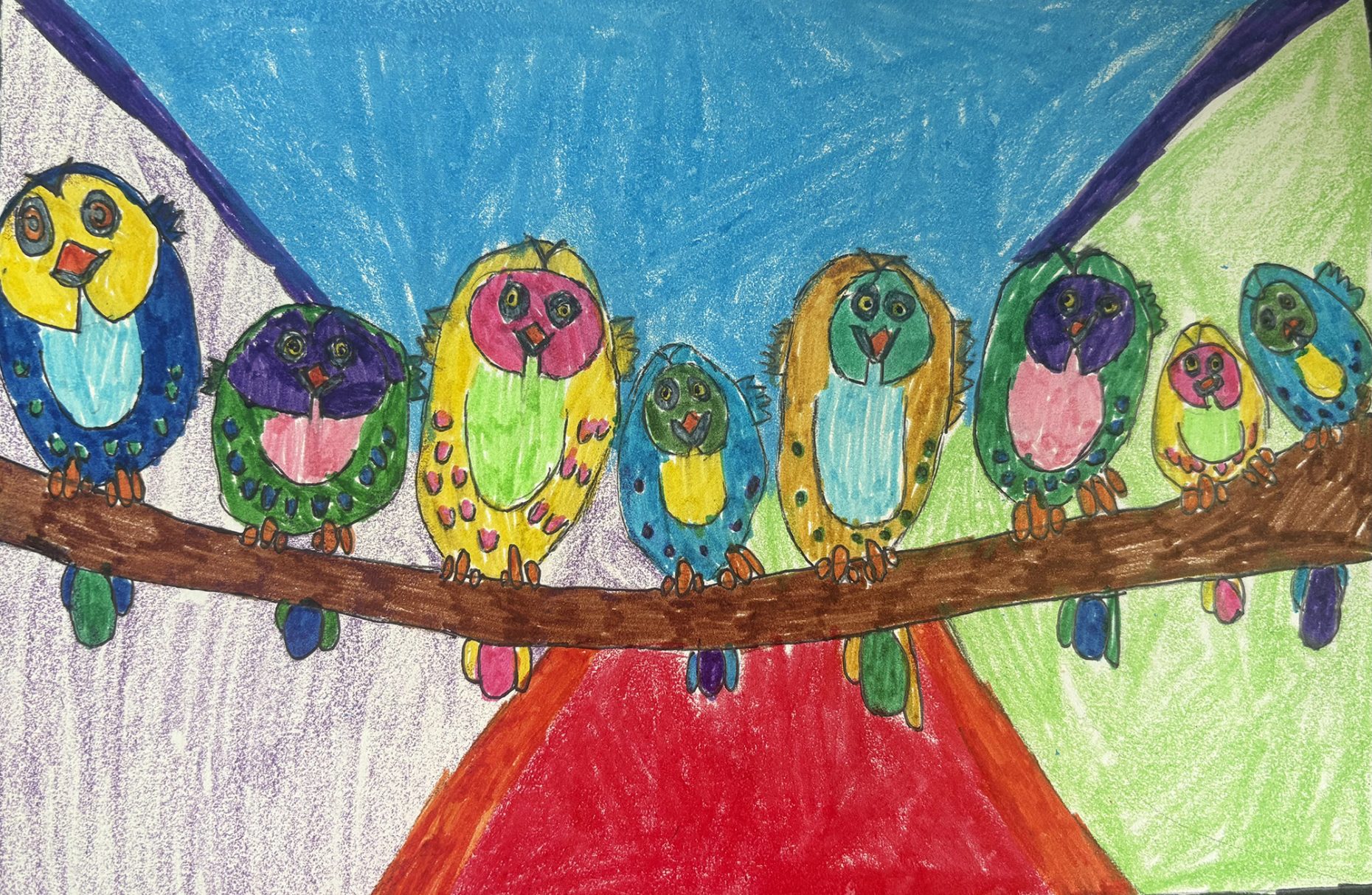 Colorful Owl Family Enjoying Each Other’s Company on a Branch at Dawn
