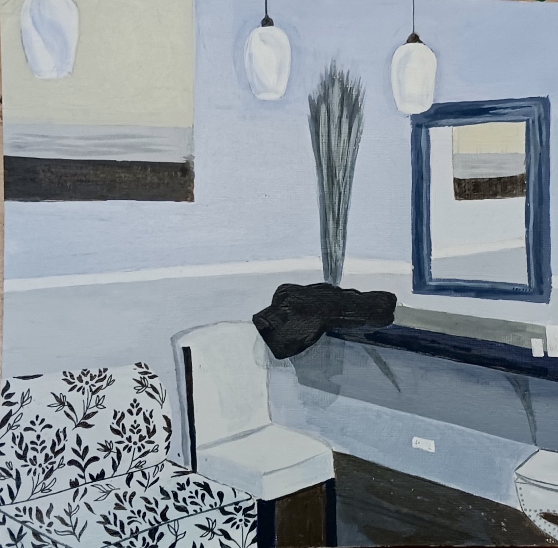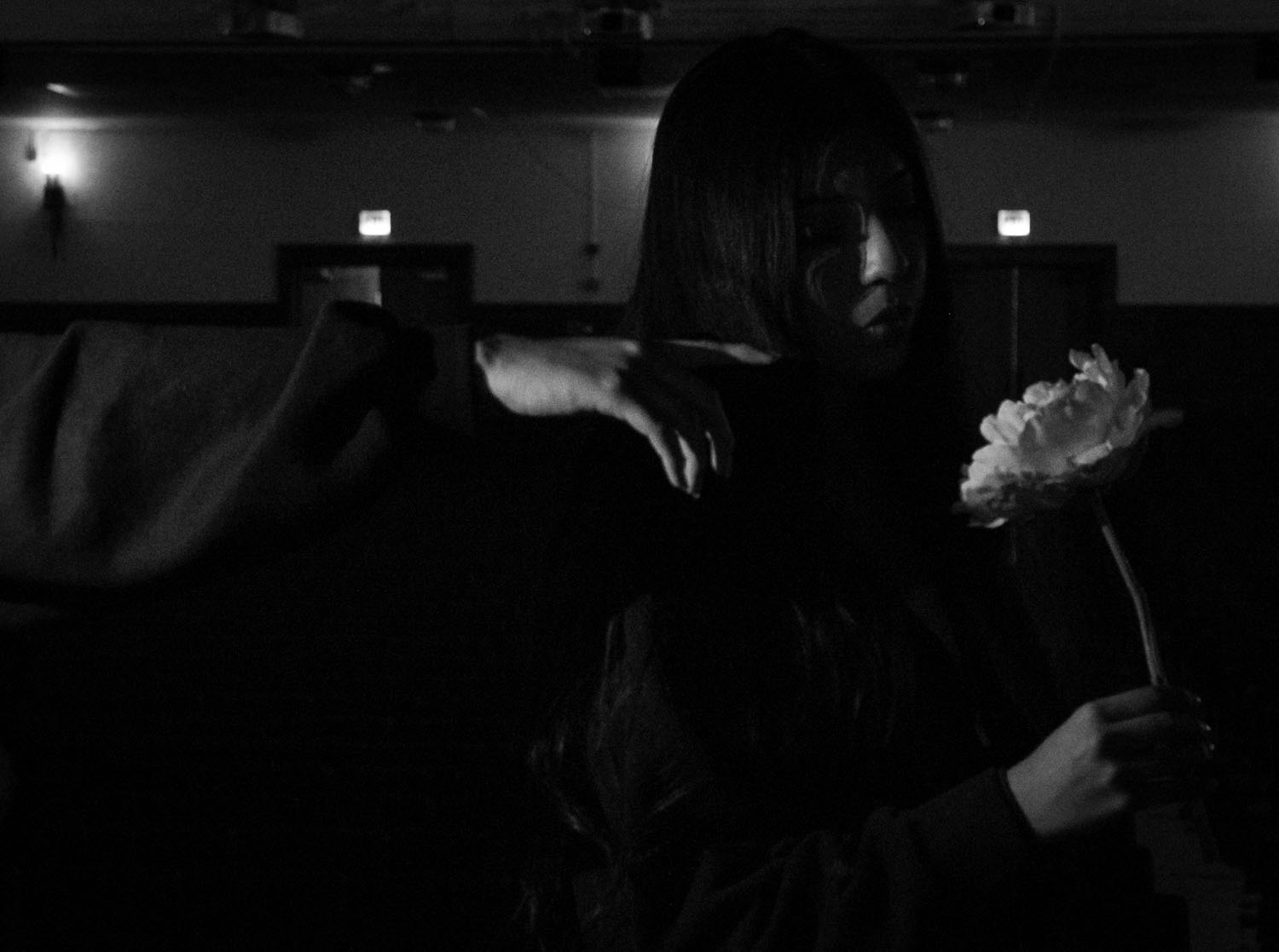 The black and white photograph features a young woman with shoulder-length hair, sitting in a dimly lit room while holding a flower in her hand. Her face is partially obscured by shadows, creating a melancholic and introspective atmosphere. The outstretched hand resting on the surface adds a sense of longing or emotional weight, as if reaching for something just out of grasp, enhancing the photograph’s introspective mood.