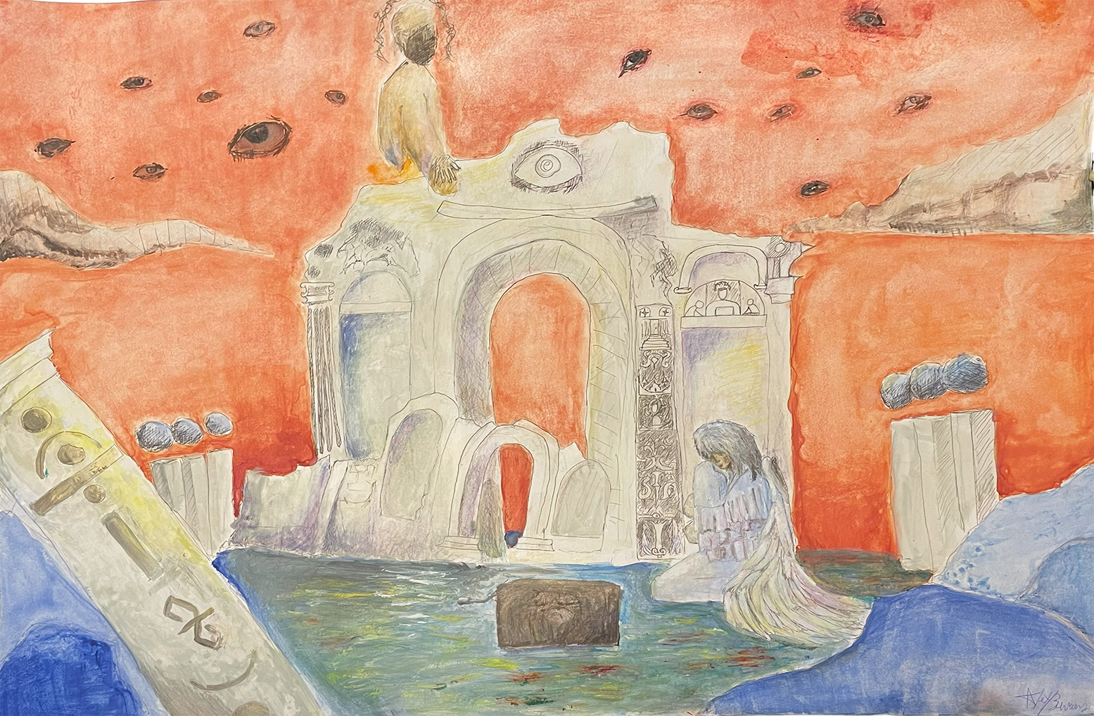 In this piece I depict a surreal landscape that appeared to me in a dream. A figure is depicted hunched over a music box, under the ominous gaze of another. Neoclassical architectural features add to the sense of disorientation. A collage of eyes further enhances the sense of being watched.