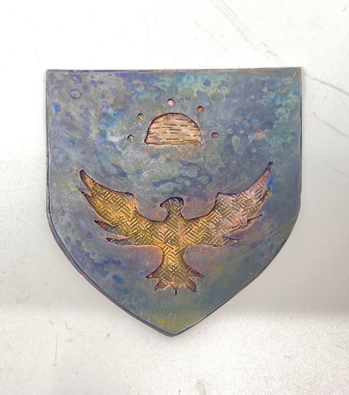 “Forged in Flight” features a phoenix’s wings outstretched in a moment of flight below a sun serving as a reminder of the enduring spirit of freedom. The background’s patina reflects the process of fire and oxidation, further reinforcing themes of endurance and transformation.