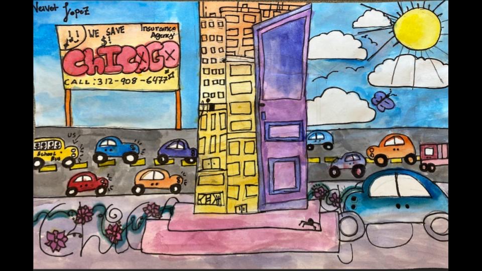 My artwork is inspired by dreaming about the city of Chicago, where I live. I drew the city inside the door, colored with a sunset, representing our city as a heavenly dream. Around the door is a busy highway representing the busy energy of our city.