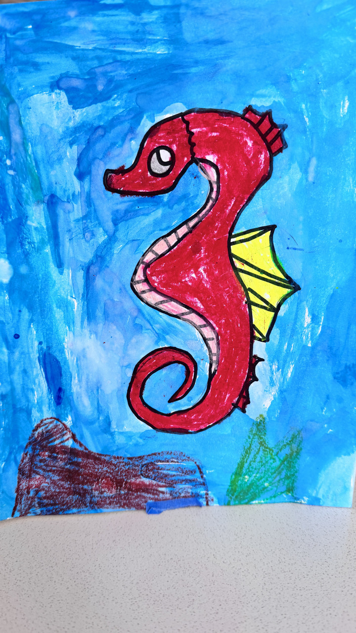 I love seahorses after we learned about them in class, especially how they don’t have stomachs, can camflouage and males carry the babies. I was asked to show it in a realistic way, but chose to do it in colors that you don’t normally see, unlike the others.