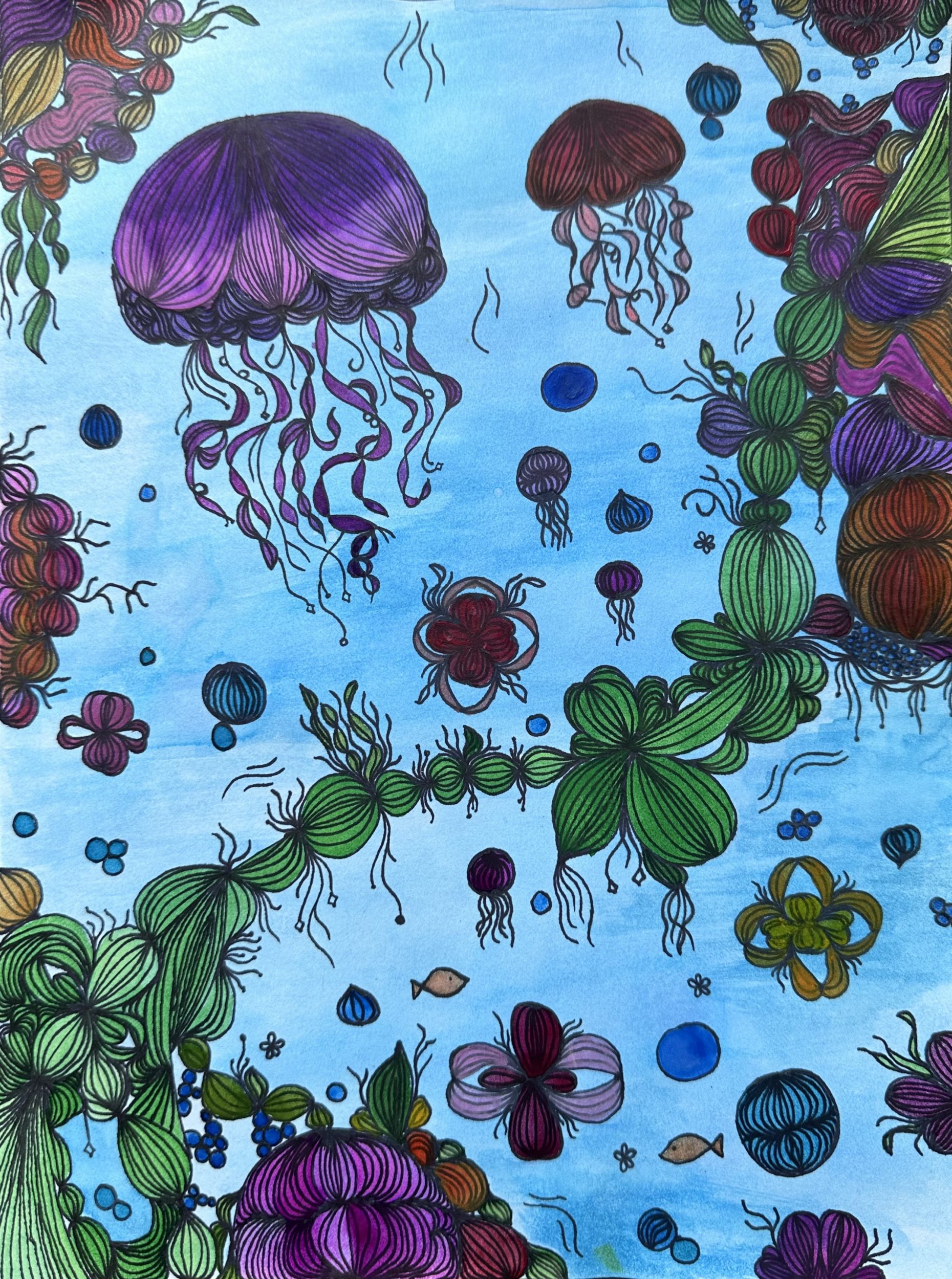 My piece includes different uses for lines and water color to give the piece some life.