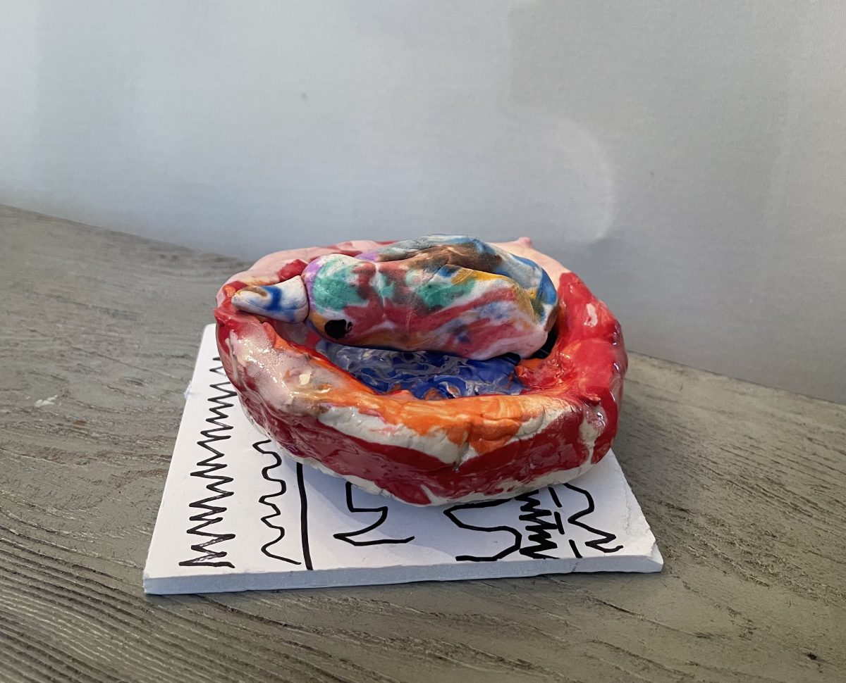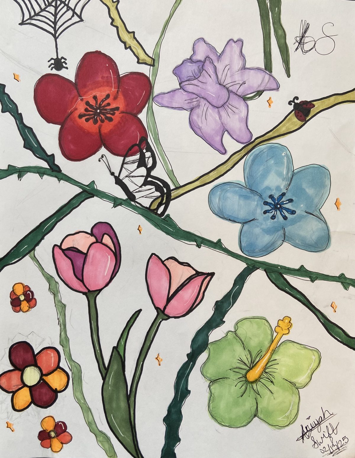 My painting is a sunset beach with palm trees and birds. My favorite parts of my artwork are the trees and the way the water looks with all the colors.