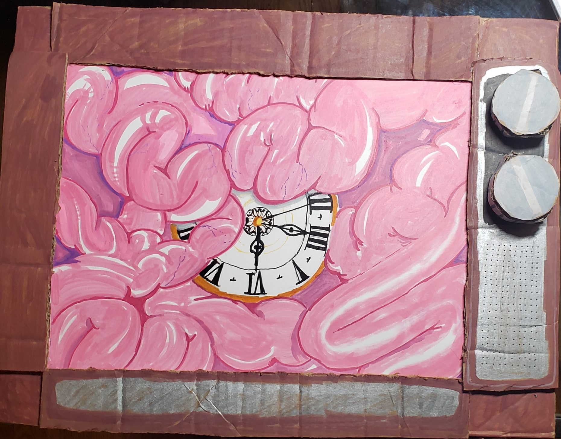 Have you ever spent a little too much time on social media? Taken time over the whole day? This art piece is about time that’s being wasted in electronics before your eyes. It’s up to you how you use your time. An Egyptian clock representing time, intestine representing a stomach and the concept of consuming time; and a TV frame representing social media. All these elements represent my art piece of “Time consuming”