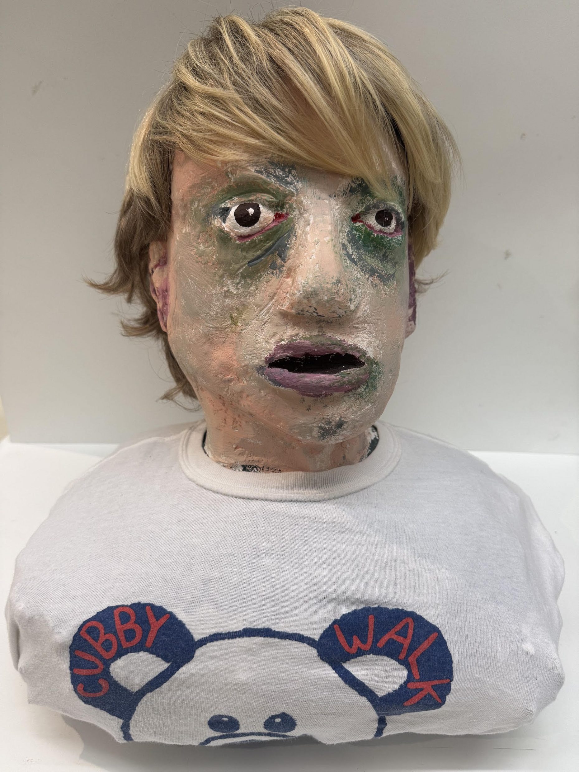 This is a collaborative piece I made with my friend Santiago V. It is plaster and burlap over a chicken wire armature, that depicts our friend Billy but as a zombie. This was for a project where we learned how to use different sculpture techniques to make a character of our choosing, so we created Zombilly.