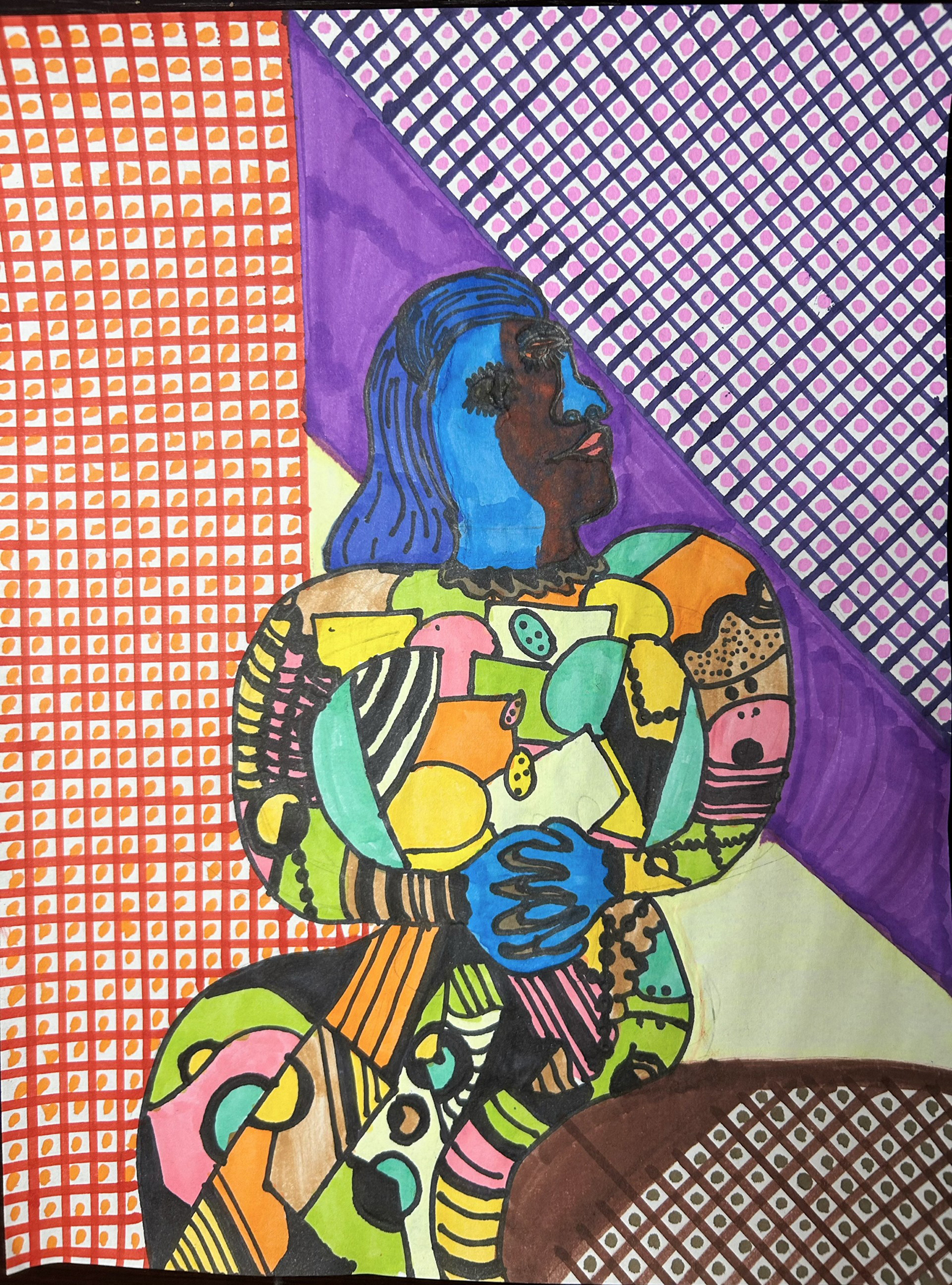 A surreal woman sitting on an abstract bench against an abstract backdrop