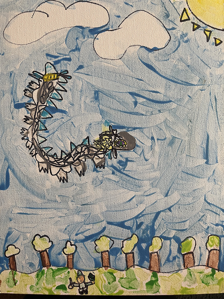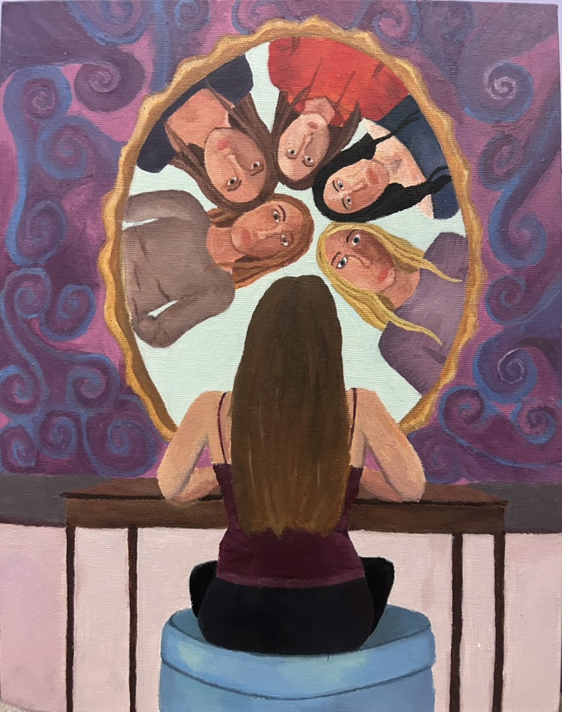 Meant to highlight the role models that have shaped the figure’s identity, this work combines self-reflection with idolization through a surreal twist. While the scene of the figure sitting before a mirror reminds viewers of their own daily actions, the jarring contrast between the mirror and the shapes spiraling out from it elevates the overall composition of the work.