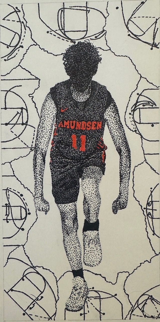 The central figure is surrounded by a variety of plays to showcase mental confusion of athletes. Unity is portrayed in the artwork as the artwork is majority of it is a monochromatic color scheme, however this is contrasted with the red to showcase perceived glory contrasted with confusion of the plays. The figure is breaking through the paper plays and facing the audience, such as a photoshoot. The figures head is lacking features and a heavy black as to further show the mental confusion.