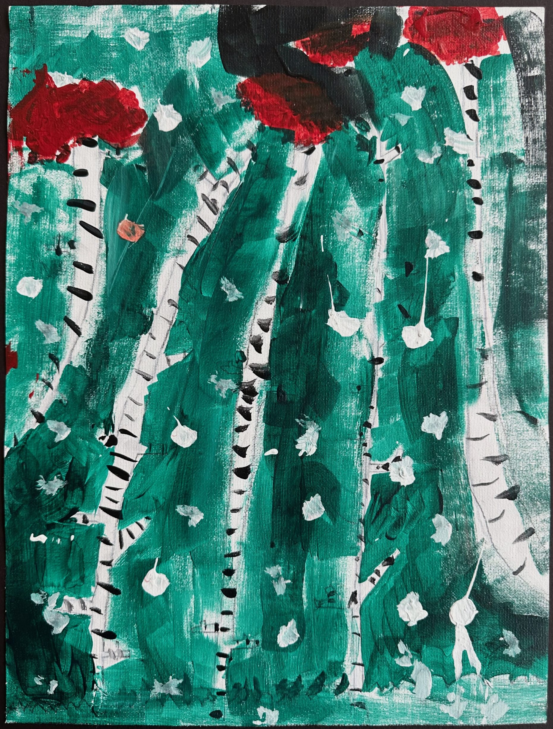 Red leaves on birch trees. This is my view from a cabin in the woods when I lie on the floor and stare out at the sky.