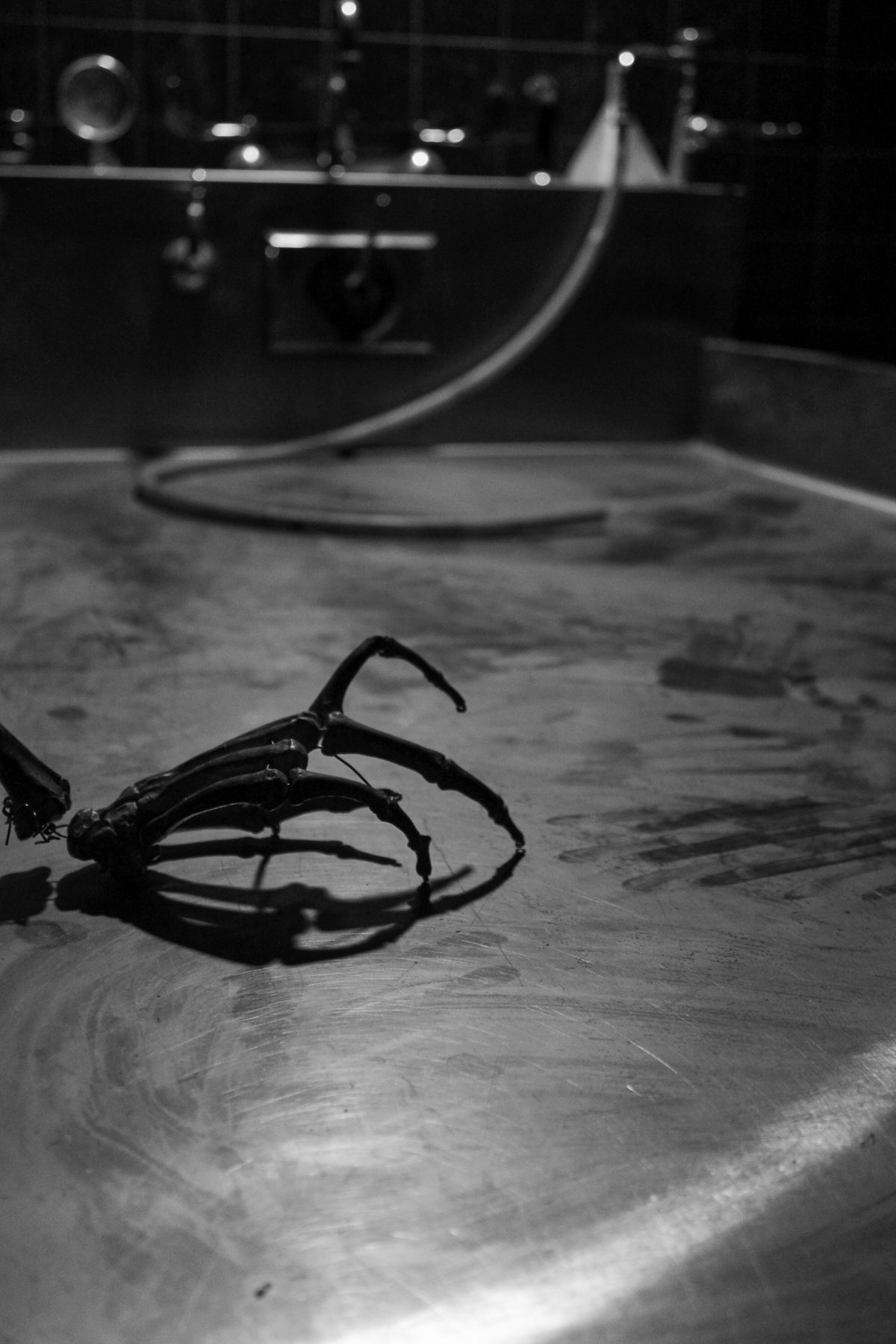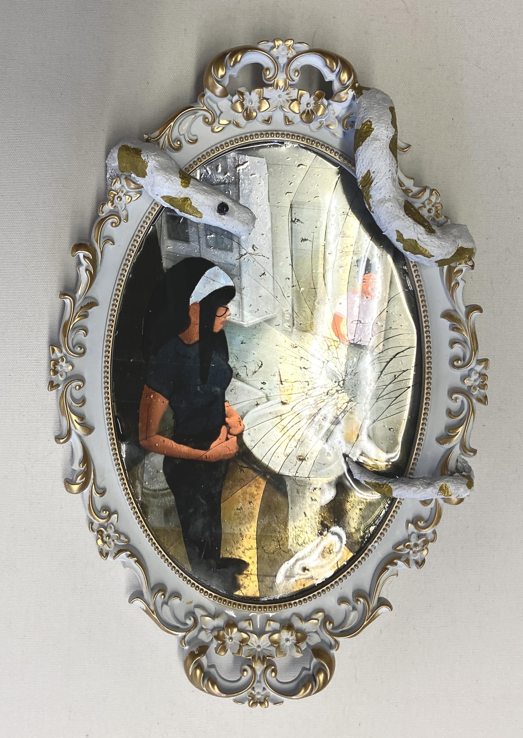 Materials: Digitally painted image applied on a mirror, then broken and sealed with resin; paper-mâché and acrylic paint on a mirror frame.