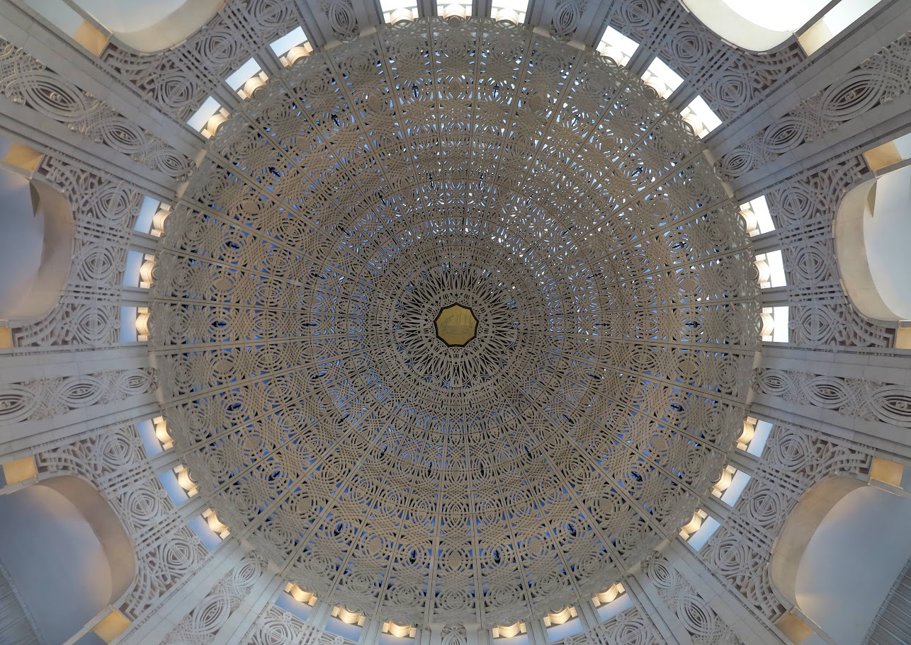 This work features the dome of the Bahá’í House of Worship in Wilmette, IL. From a distance, the large windows guide towards the center “eye.” However, looking closer reveals the incredible architectural detail found at this site.