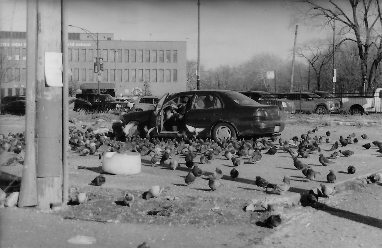 This was taken outside the Pulaski station off the Orange Line; two men pulled into this lot, stole these pigeons (about 40-50!), and put them in boxes in the back of their car! Truly a sight to see.
