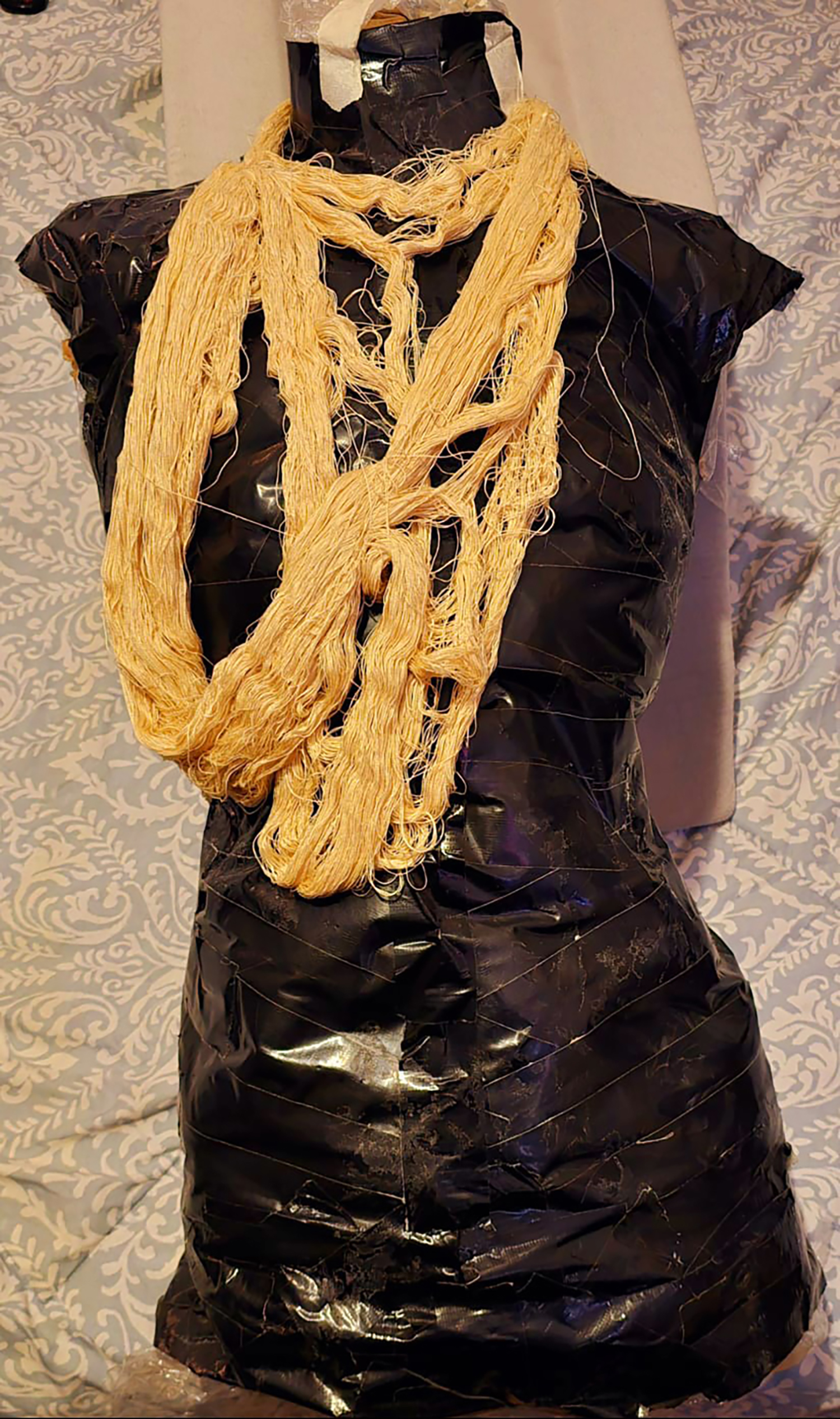 Materials: paper bags, plastic bags and duck tape with string scarfring