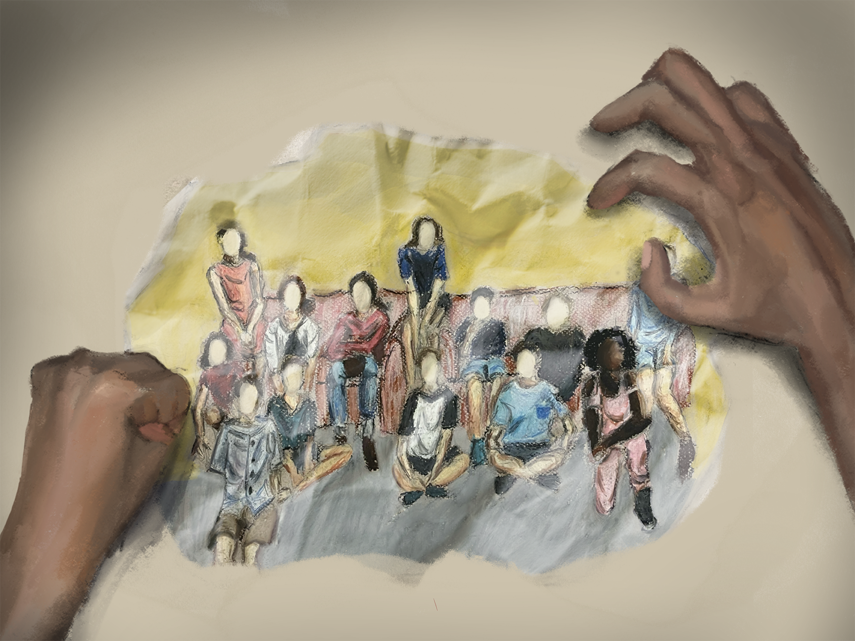 This piece is about my feelings towards being the only black girl in class for the majority of my youth. The drawing in the middle represents a yearbook photo from when I was in 5th Grade, where I am the only black girl (in the bottom right). The hands represent me at an older age, looking back at this moment with frustration.