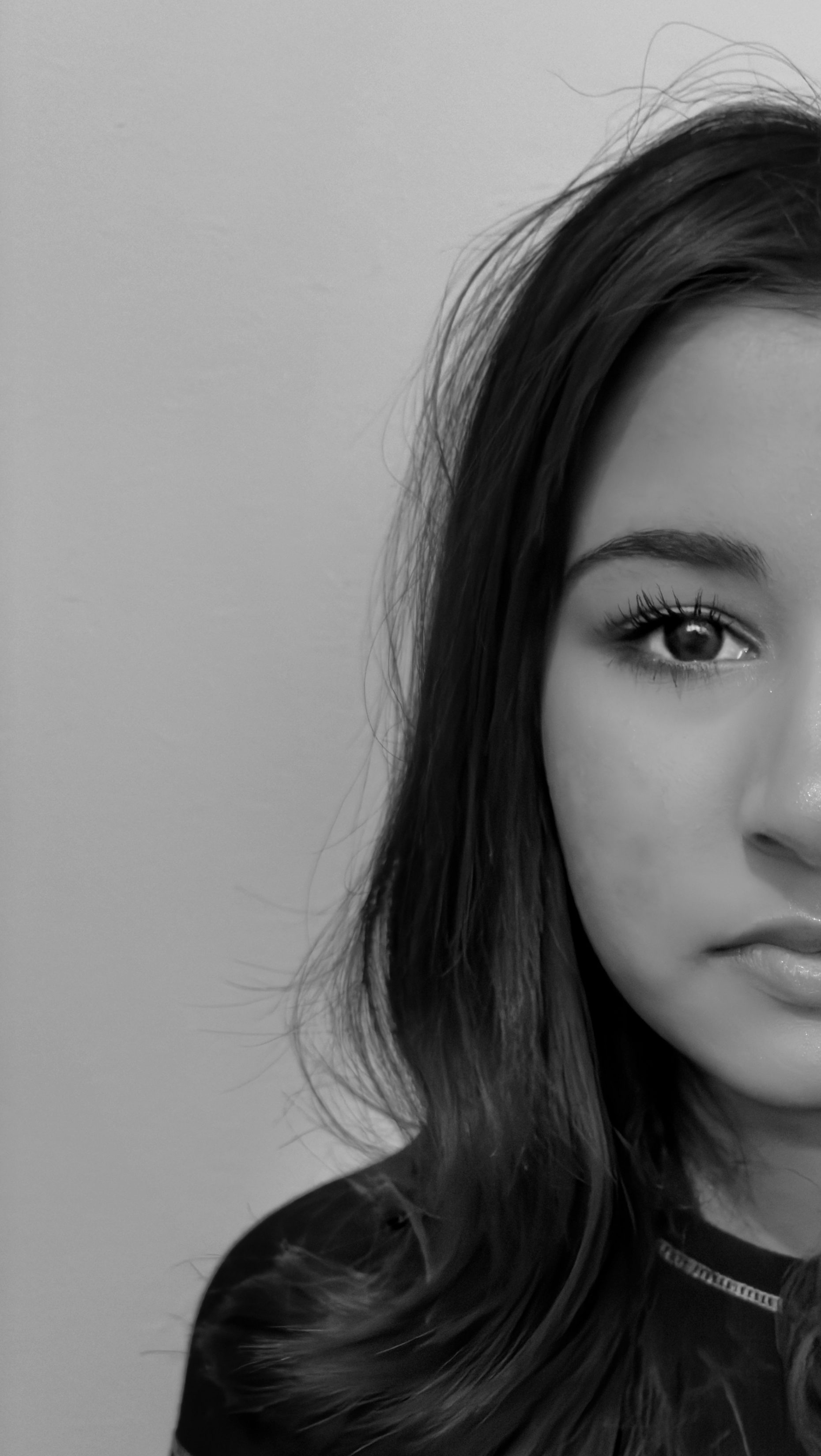 A black-and-white portrait captures only half of a young woman’s face, creating a sense of fragmentation. This composition reflects the experience of navigating between two identities, highlighting themes of change, self-perception, and belonging.