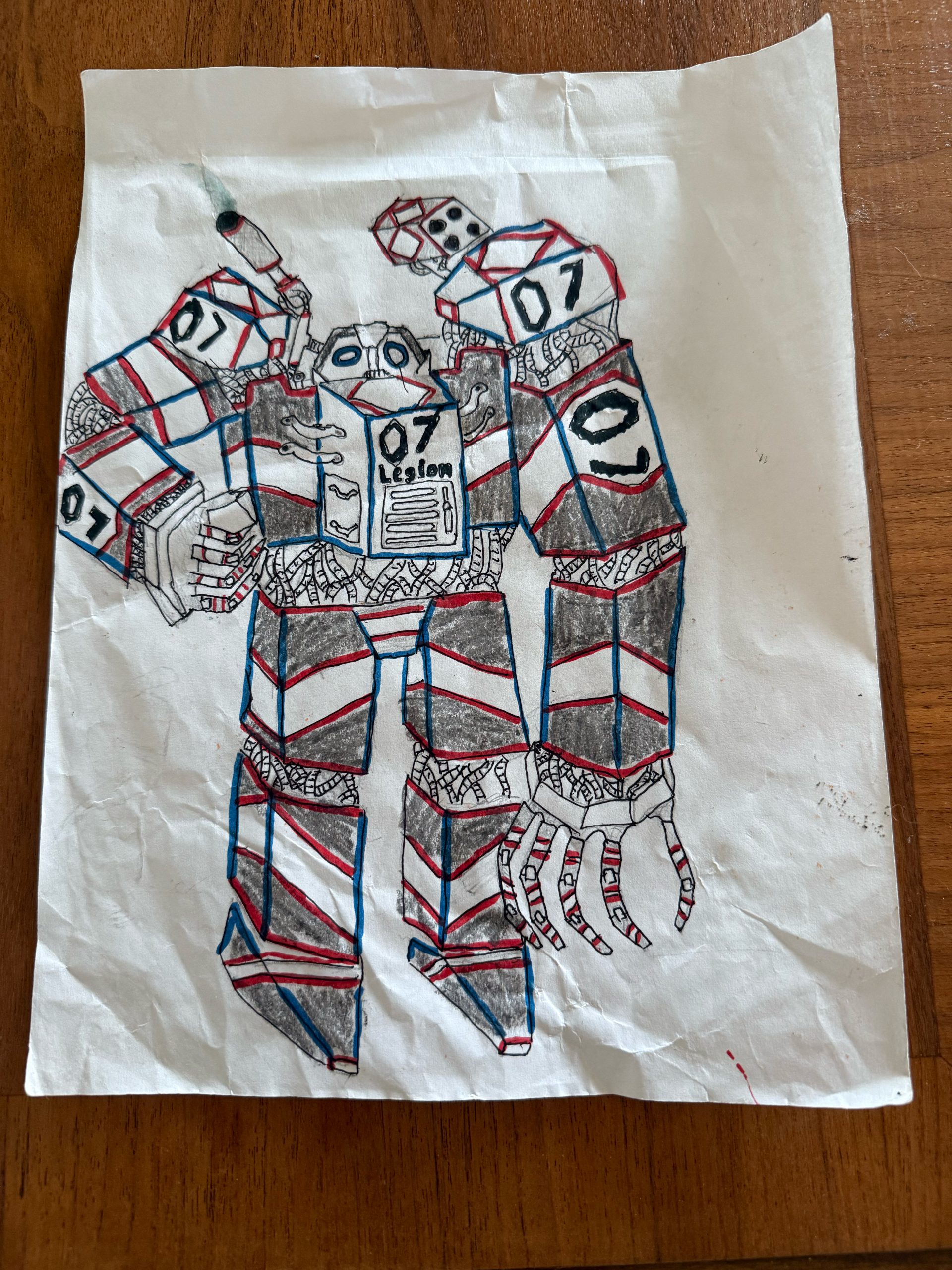 I was feeling happy when I drew this robot because it was fun. I like robots.