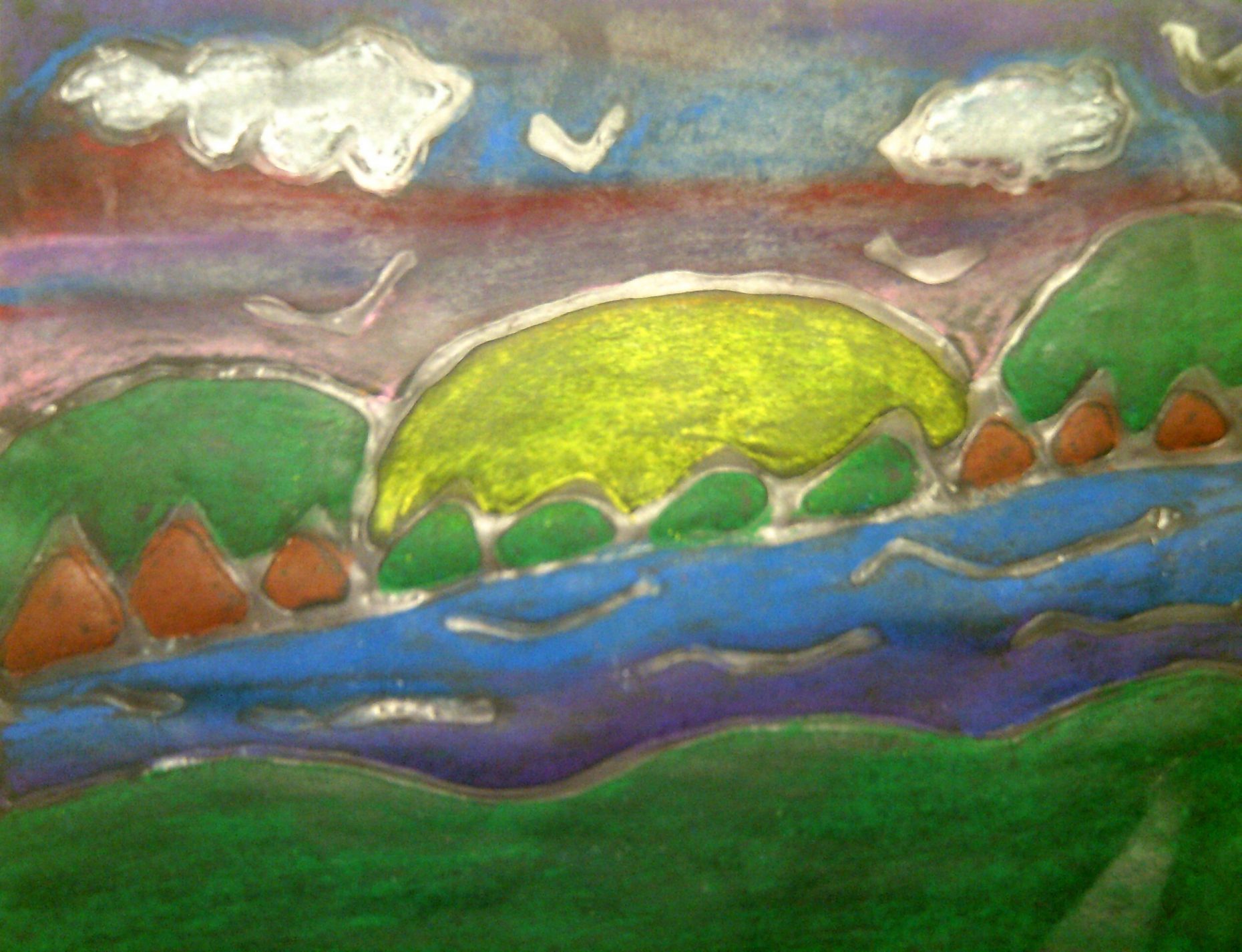 Landscape inspired by Ted Harrison. On 9 X 12 black construction paper, glue, and oil pastels.