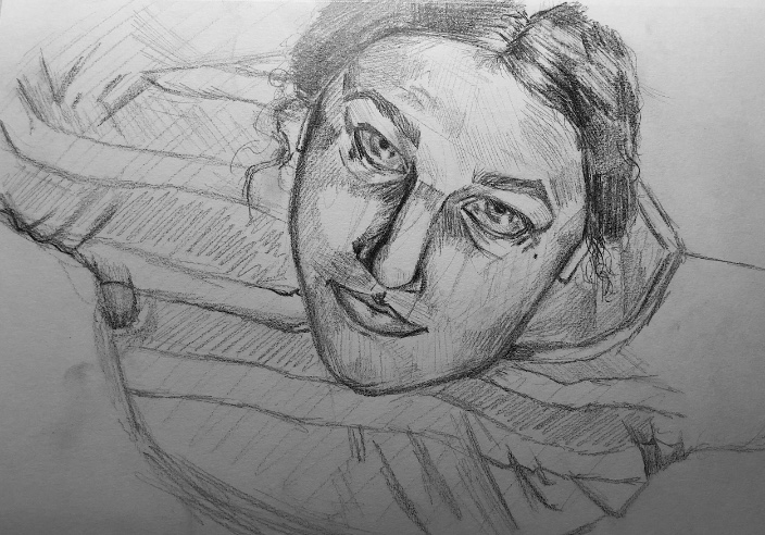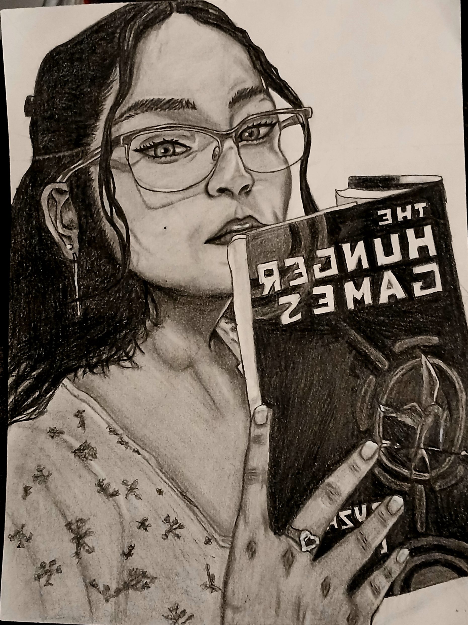 My alter ego is confidence and defiance. I represented this through what I wear and own, showcasing my worth. With my hoop earring, ring, and one of my favorite books, “The Hunger Games,” I demonstrate my confidence and my defiance against caring about others’ opinions. My serious expression signals that I won’t be pushed around, and my pose reflects my self-assuredness. Completing this portrait pencil drawing taught me that I am my own person, complete with flaws and qualities that define me.