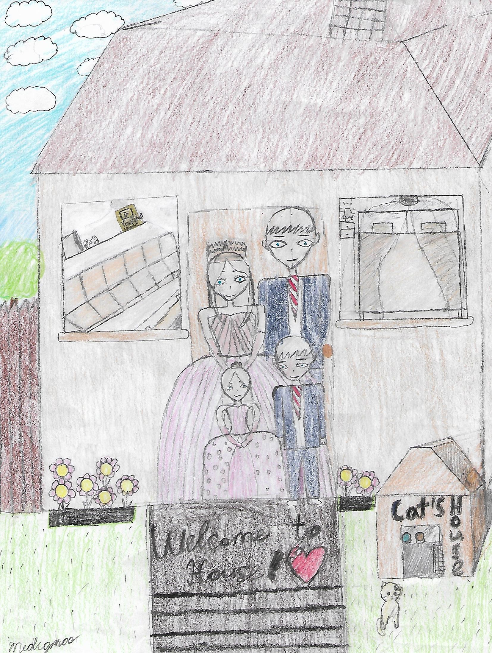 It stands in the countryside and radiates warmth and charm. The house itself is a cosy cottage. A small wooden fence encloses the house. Inside the house, there is a living room with a sofa, a Playstation and a golden YouTube button on the shelf. There is also a TV set next to the sofa. In the opposite room there is a double bed with a translucent canopy, next to it there is a small bedside table with a lamp. My husband, children and me are in front of the house. Next to the house there is my kitty’s small house, inside it there is a couch, bowls of water and food.