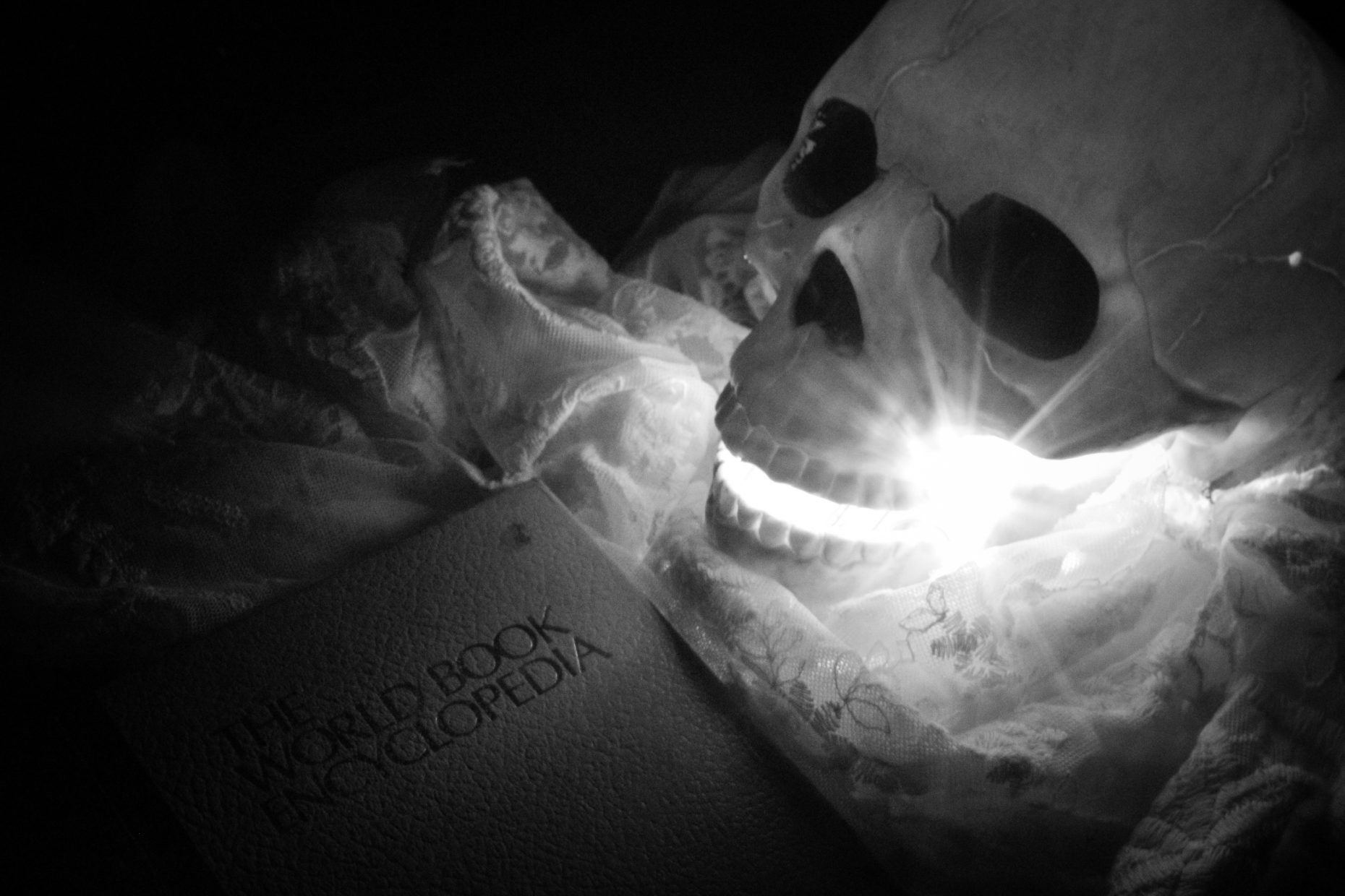 This photo was inspired by film noir photography. I used a flashlight inside the skull to provide mystery through the light and shadows within the photo.