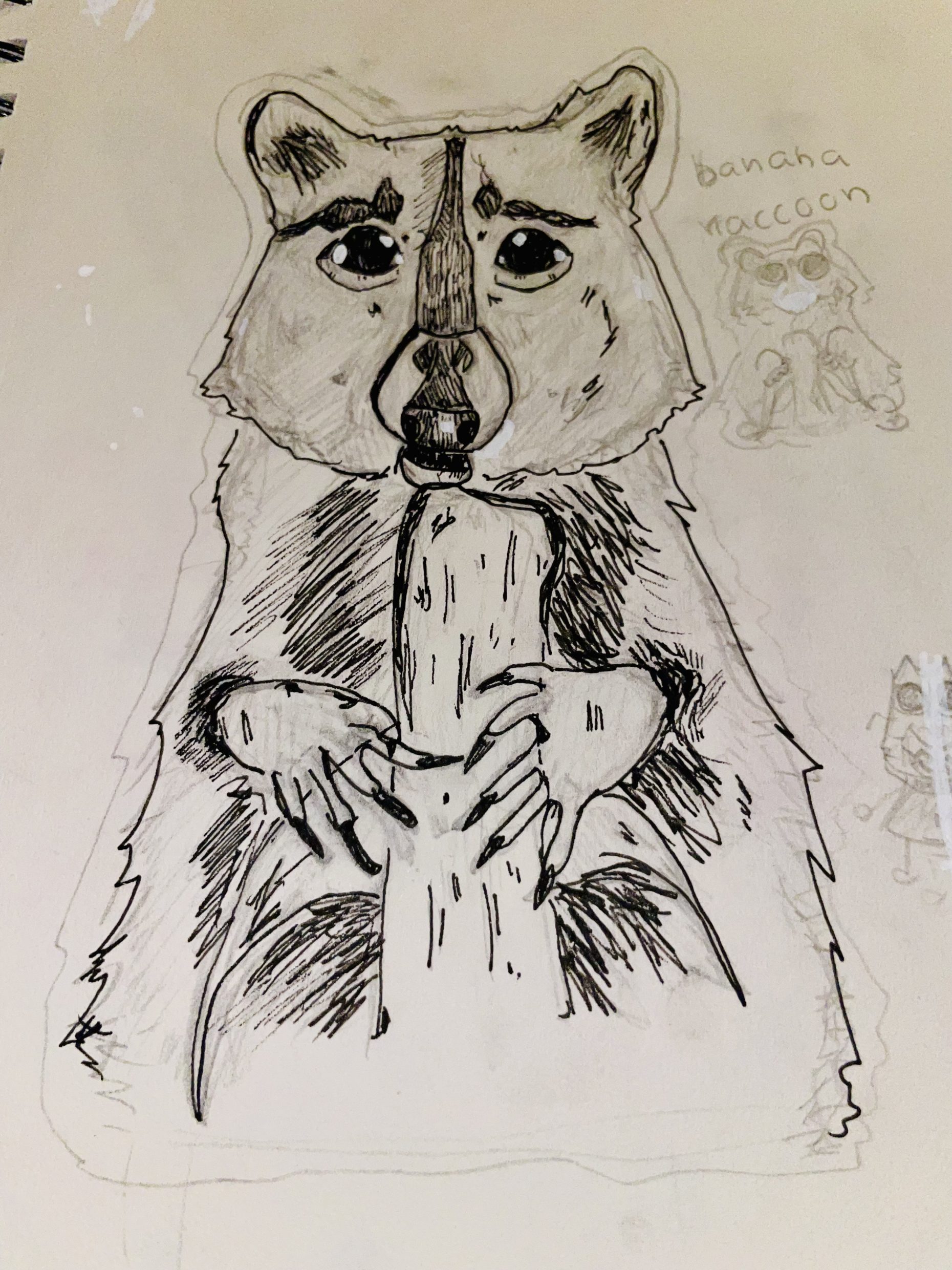 A raccoon eating a banana.