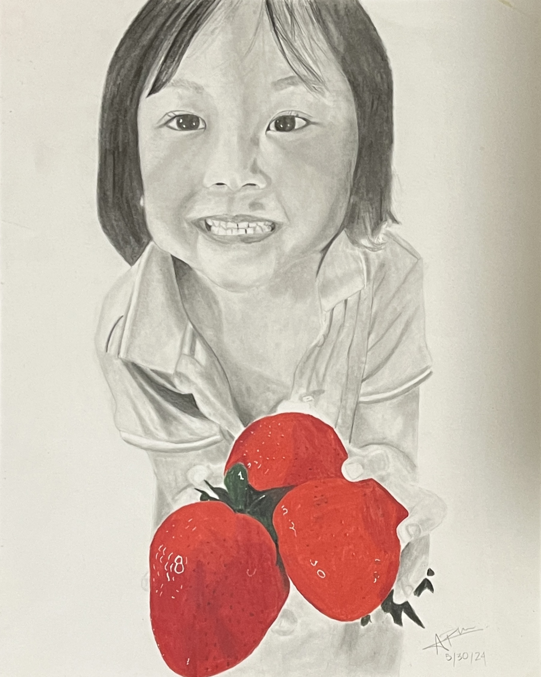 This artwork is of my little sister holding a strawberry. It’s one of my favorite pictures of her because she was so happy that the strawberry was so big. She asked my mom to take a picture of them because she had never seen one this huge before. Since then, it has been my favorite picture, and I want to make it even more special by drawing it.