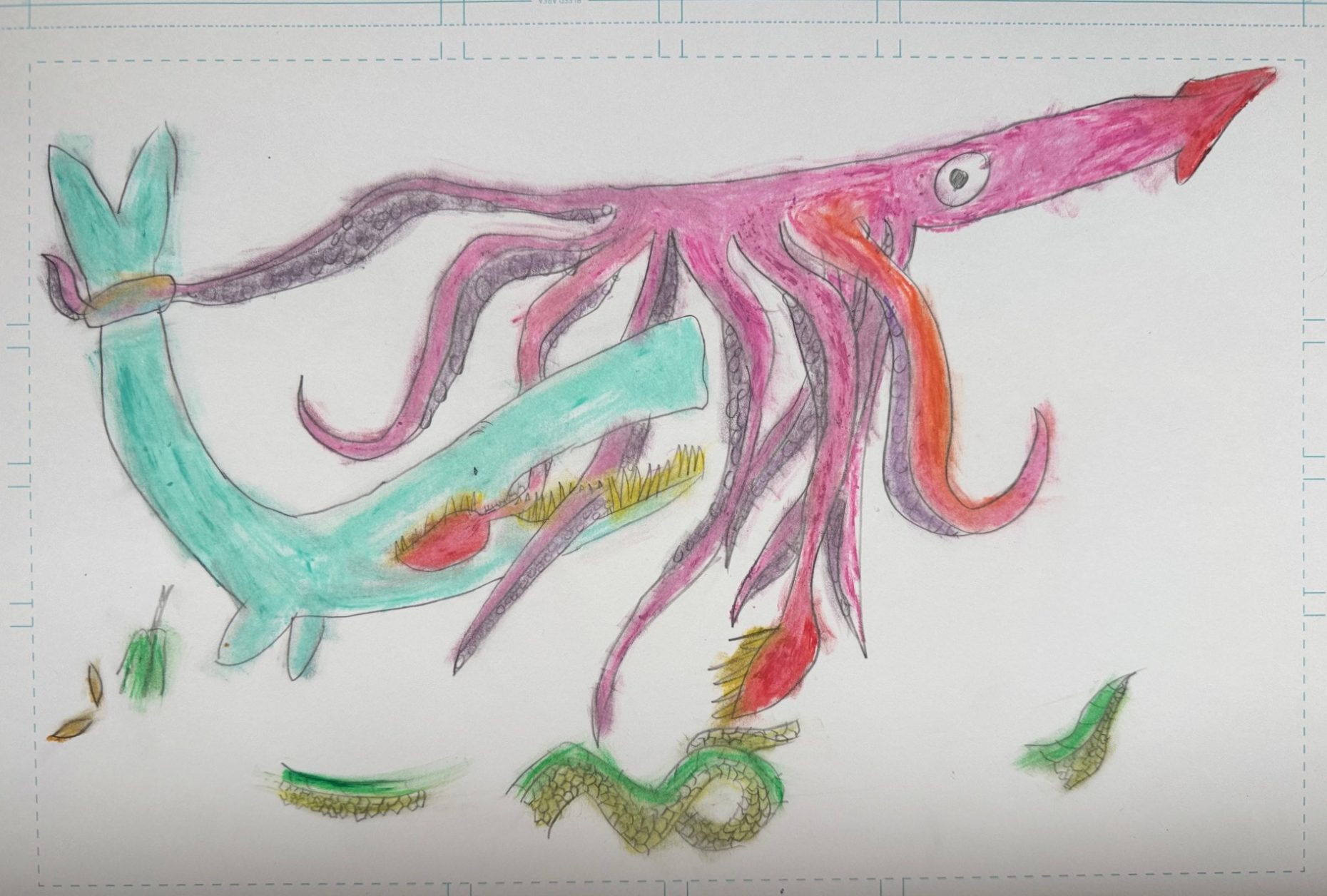 I was inspired by a book about a sperm whale versus a giant squid. In the book, the sperm whale won the battle.