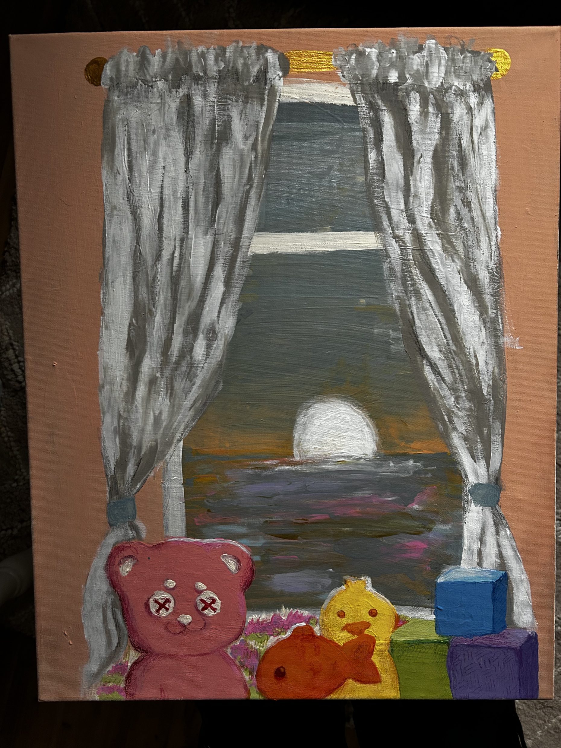 When I was introduced to the RE-VER-BER-ATE festival in my art elective, I had experienced a somewhat peculiar dream the previous night. I was looking outside of my bedroom window, with images of the sea and beaches flashing behind the glass. When I was told the prompt for the festival submissions was “dream”, I knew exactly what I would paint. This piece is one of my first ever paintings.