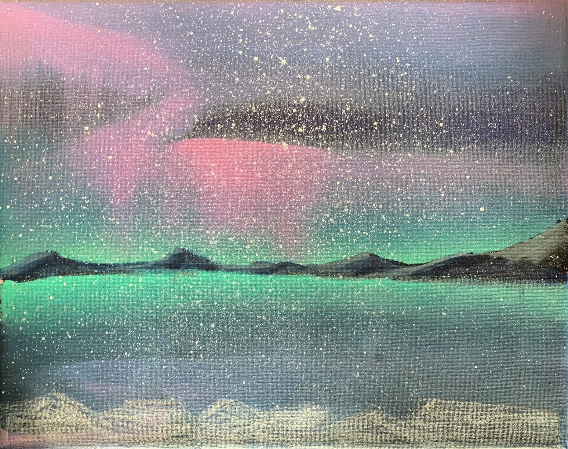 I painted “View of the Northern Lights from Iceland” because Patricia Perez, my World Art teacher at Eugene Field Park, assigned it. It’s acrylic paint on canvas. I like the stars and the reflection of the stars on the water.