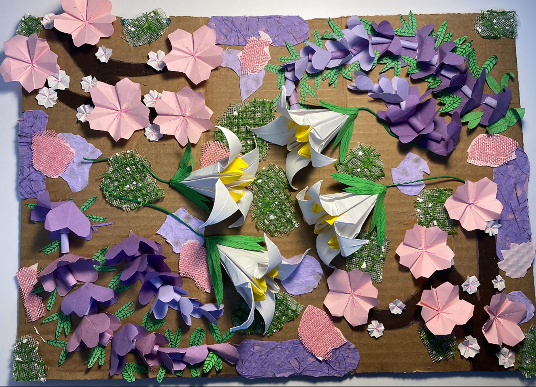 Flowers have heavy significance in many places, and I really love the art of origami’s so I decided to combine both by creating origami flowers and arranging them by their significance. The wisteria is protection, so they surround the innocent lilies and help fortify the fragile beauty of the cherry blossoms.