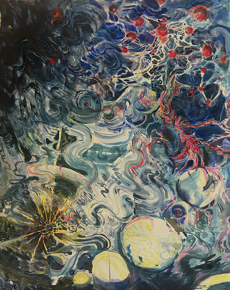 Nature provides a blueprint for life. I inspected mold and cell organelles under a microscope and biology textbook to create a macrocosm with structures at different scales (atomic structure, eyes, cell organelles, nerve cells, roots, moon phases) related by their functions of connection, communication, and growth to explore vulnerability and personal evolutions.