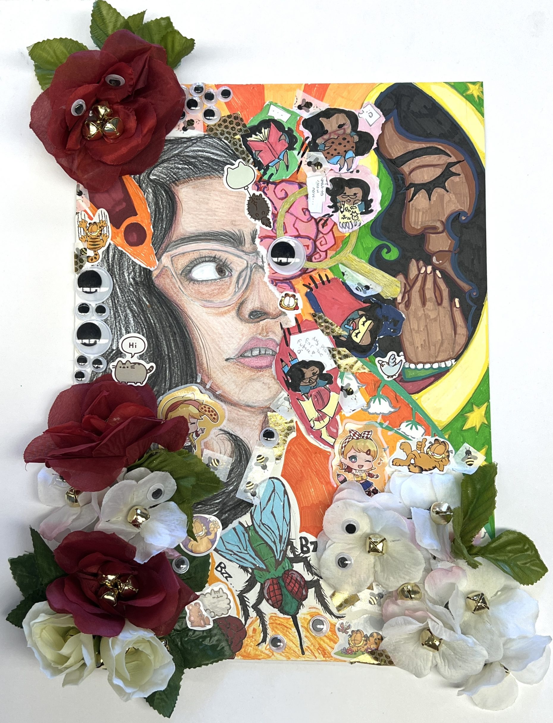 This is a visual representation of myself. I made it look as if my mind was split and that different parts of myself was spreading throughout the portrait. The significance of my symbols are that for the brain I want to study psychology and then the mini me’s are kinda meant to be stuff I think/do in my daily life coming out of my brain as little brain critters along with a religious figure that I’ve known for a long time and my family and I are catholic. I also love flowers so I included them with googly eyes and bells to give of a bit of silliness and also I like the jingles of bells. I scattered different cartoon characters along with my 2 favorite characters to kinda show that I really love drawing fictional characters.