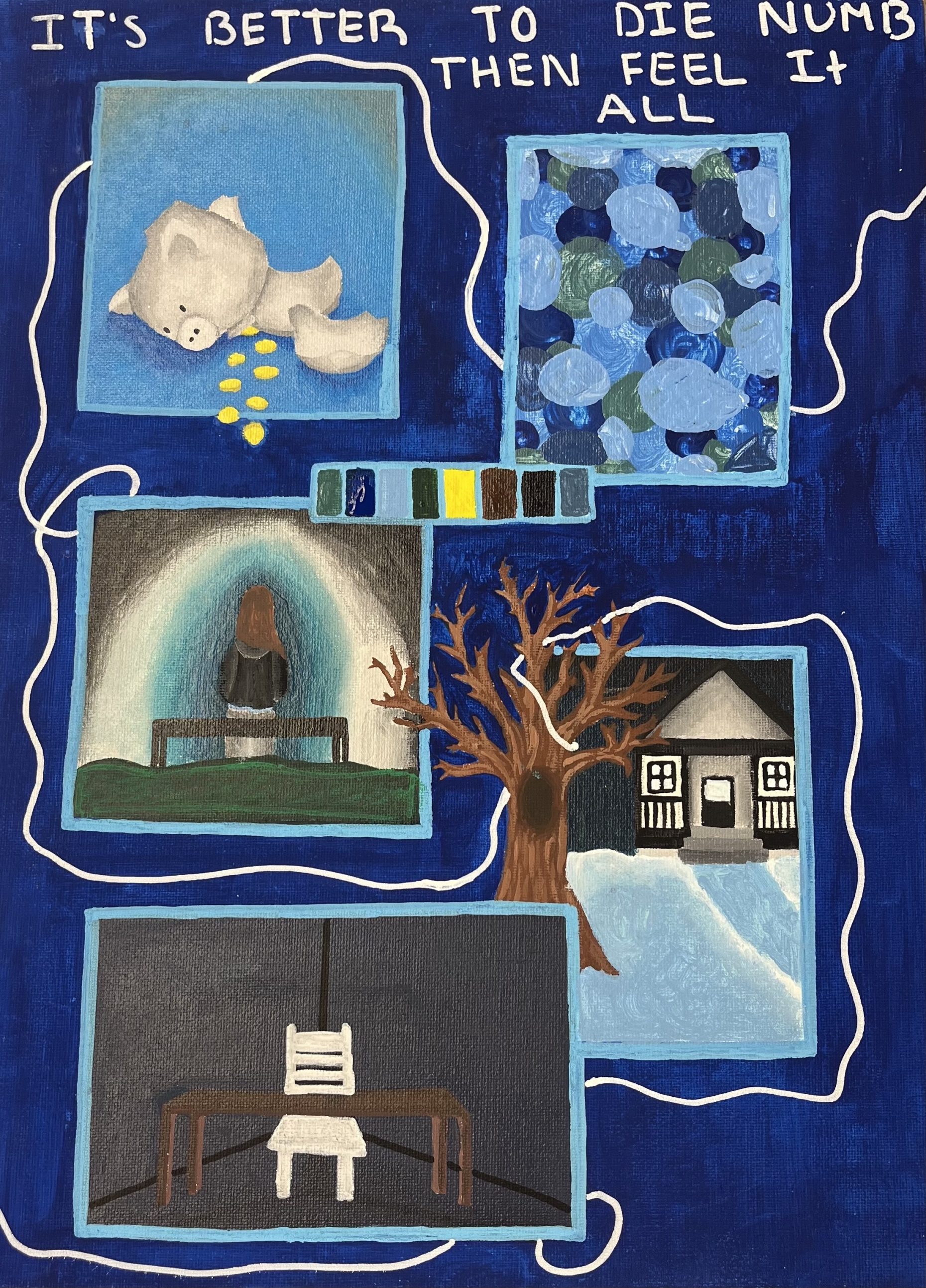 This painting is an exploration of the feeling of emptiness. From the color, to the imagery, to the words used in this composition are meant to portray this mood.