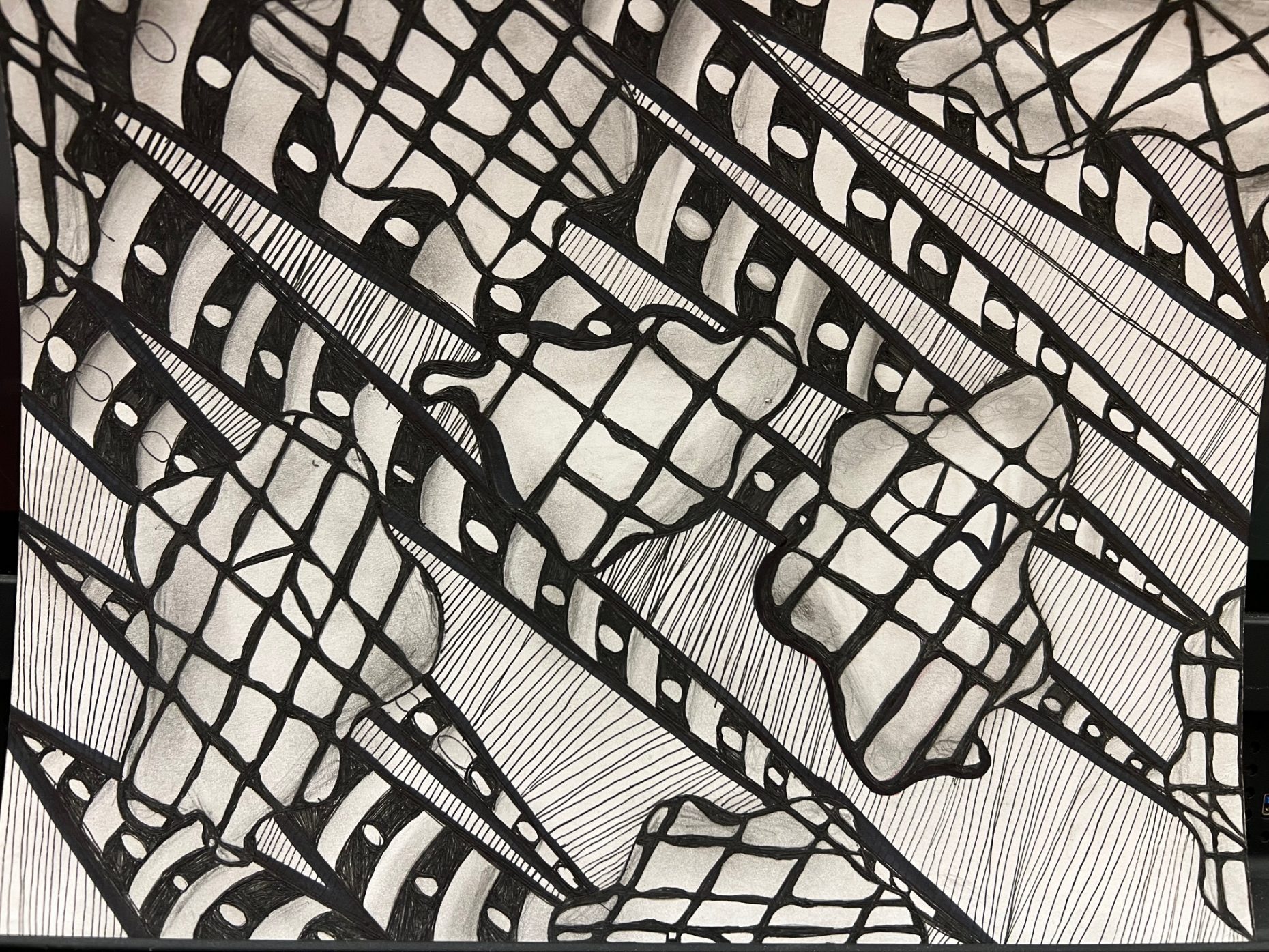 In this art piece, Enter My Mind Map, I wanted to capture an illusion of movement. I did this by using a dark ink pen and shadowing with a graphite pencil. The smearing of the pencil allows the piece to apprehend the illusion. Although I normally enjoy a lot of color, limiting the palette to black pen and graphite pencil allowed me to show my side of exploring new ways to make vibrant, exciting pieces.