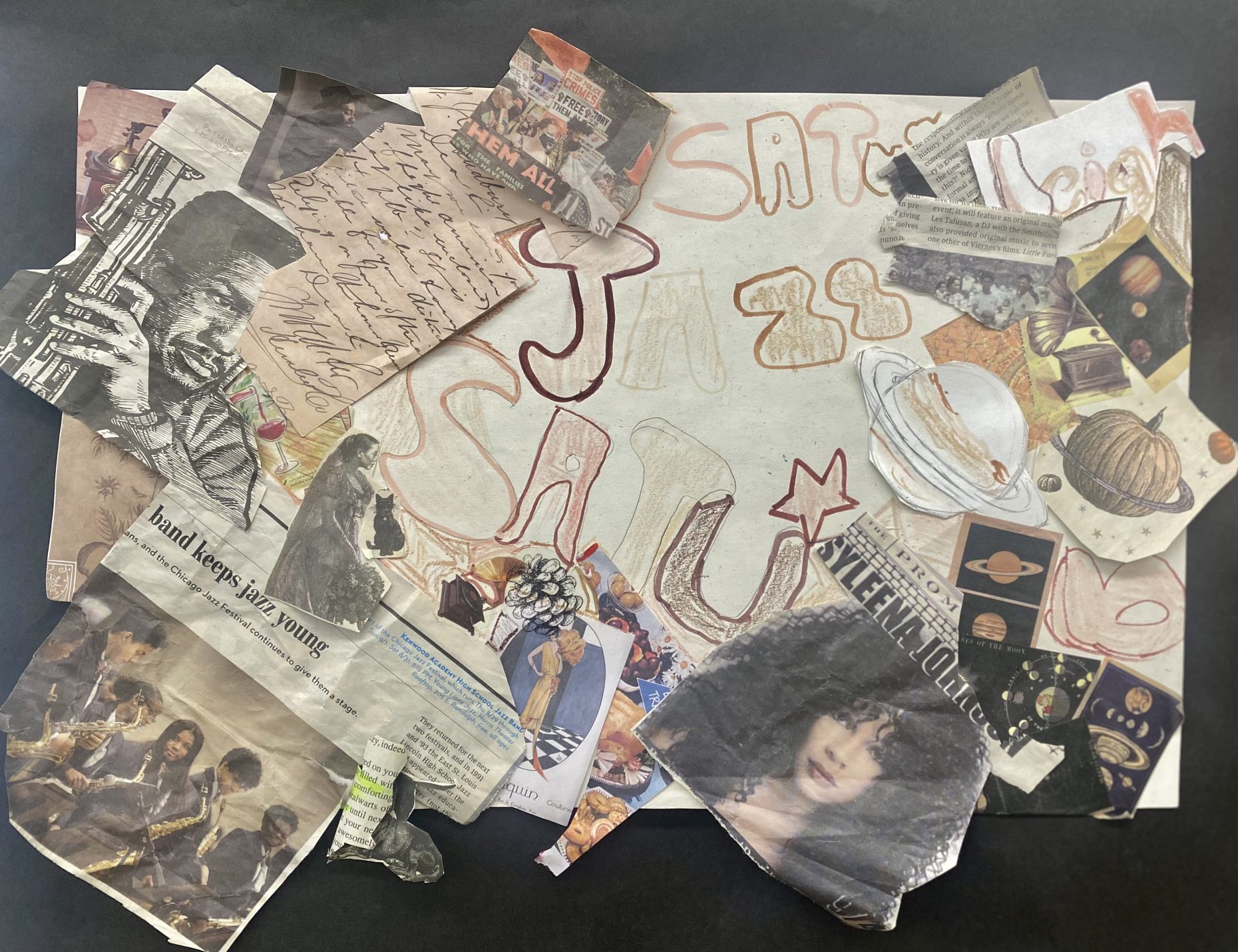The theme of this project was identity. I chose to focus my collage on my love for music, and use images and draw additional details that would represent the song Saturn by SZA.