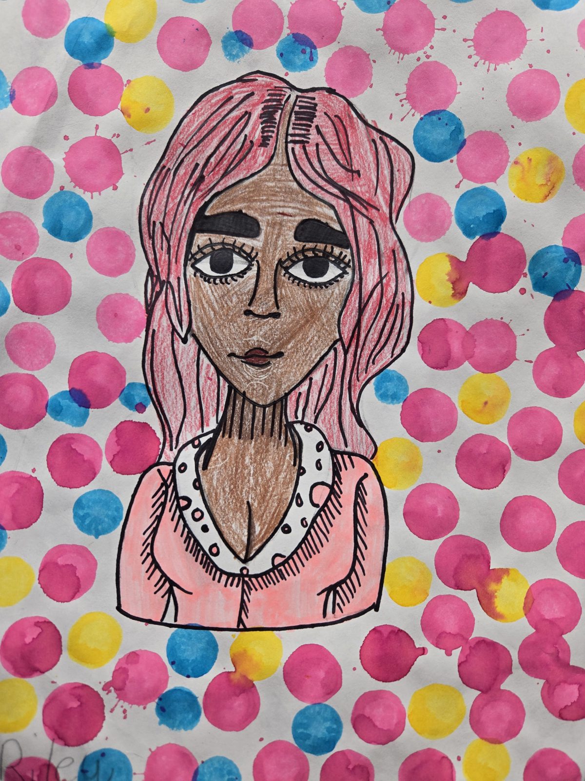Description: This art piece is inspired by Faith Ringgold’s quilt paintings for the illustrated book, Tar Beach. Sherry expressed herself from head to toe with a pose in the sunshine framed in colorful patterns.