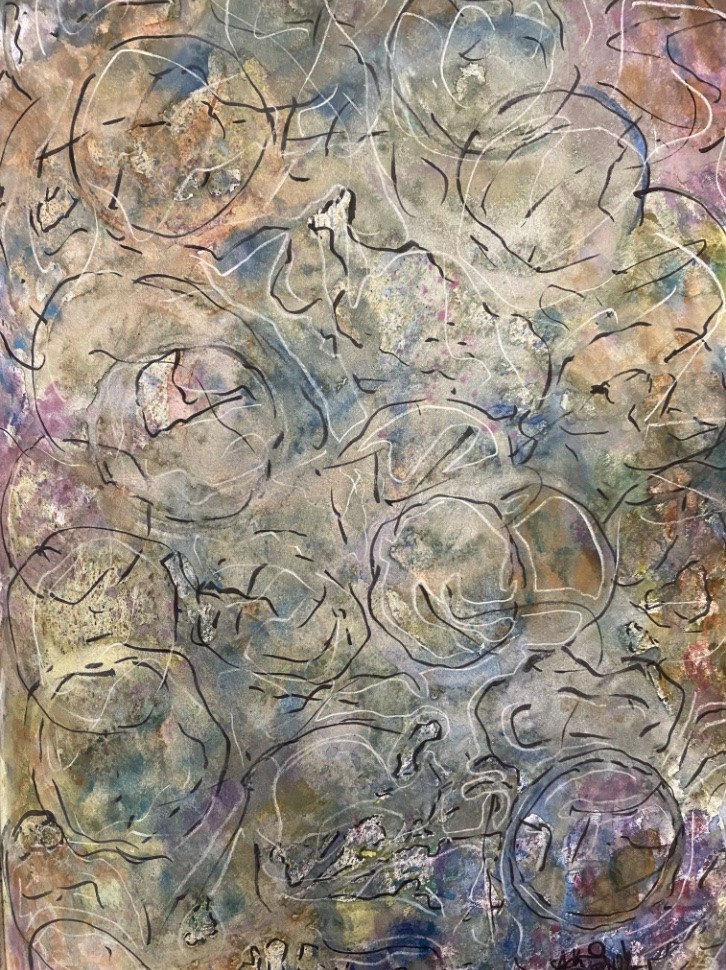 Description: I created this art piece because my watercolor cup was on my paper and the heat rings left on my paper inspired me.